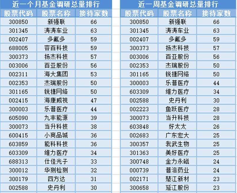 从个股调研情况上来看,最近1个月(9月28日-10月27日)最受公募基金关注的是新强联,属于通用设备制造行业,主营业务为大型回转支承和工业锻件的研发、生产和销售。共有66家基金管理公司参与调研,其次是涛涛车业和多氟多,分别接受63家、59家基金管理公司的调研。