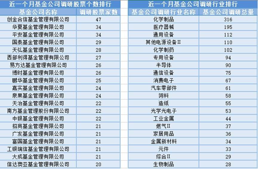近一个月(9月28日-10月27日),创金合信基金参与公司调研的数量最多,共调研47家上市公司,然后调研较为活跃的还有华夏基金、平安基金和国泰基金,分别调研34家、34家、29家上市公司;从调研行业上来看,基金公司对化学制品行业的上市公司调研次数最多,共有316次,其次是医疗器械行业,基金公司调研了195次。